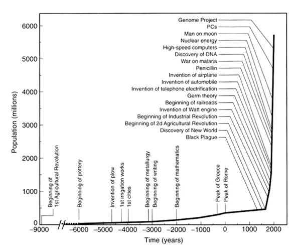 این نمودار جمعیت جهان در طول تاریخ را نشان می دهد. به نظر شما چه اتفاقی در حدود سال 1700 میلادی افتاده که جمعیت جهان به شکل انفجاری رشد کرد؟ می توان گفت انقلاب صنعتی یا می توان گفت اراده الهی و یا علل زیادی در طول هم برشمرد. آنچه مسلم است این است که میلیون ها و میلیارد ها انسان فرصت زندگی پیدا کردند و این به خودی خود ارزشمند است.