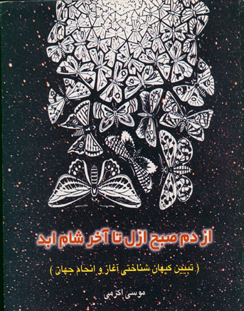 2. دکتر اکرمی را که می شناسید – جناب سیاوش که خوب می شناسد!- ایشان کتابی تألیف کرده اند با عنوان اصلی «از دم صبح ازل تا آخر شام ابد» و عنوان فرعی «تبیین کیهان شناختی آغاز و انجام جهان». کتاب پر است از فرمول های ریاضی، که هیچ از آنها سردر نمی آورم، و شعرهای بزرگان ادب فارسی، که هیچ از ارتباطشان با فیزیک جدید سر در نمی آورم. با این همه طرح روی جلد تا بخواهید جذاب و زیباست.